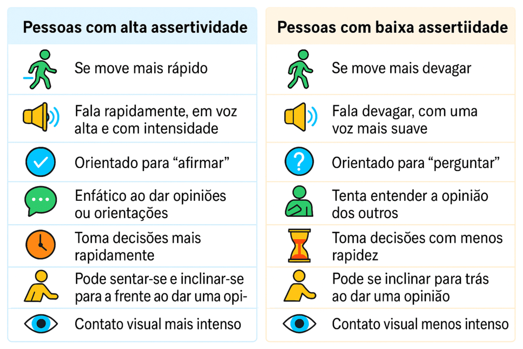 - Assertividade: é o quanto a pessoa toma iniciativa e se posiciona nas conversas ou decisões. Quem é mais assertivo tende a falar o que pensa de forma mais objetiva e direcionar ações.