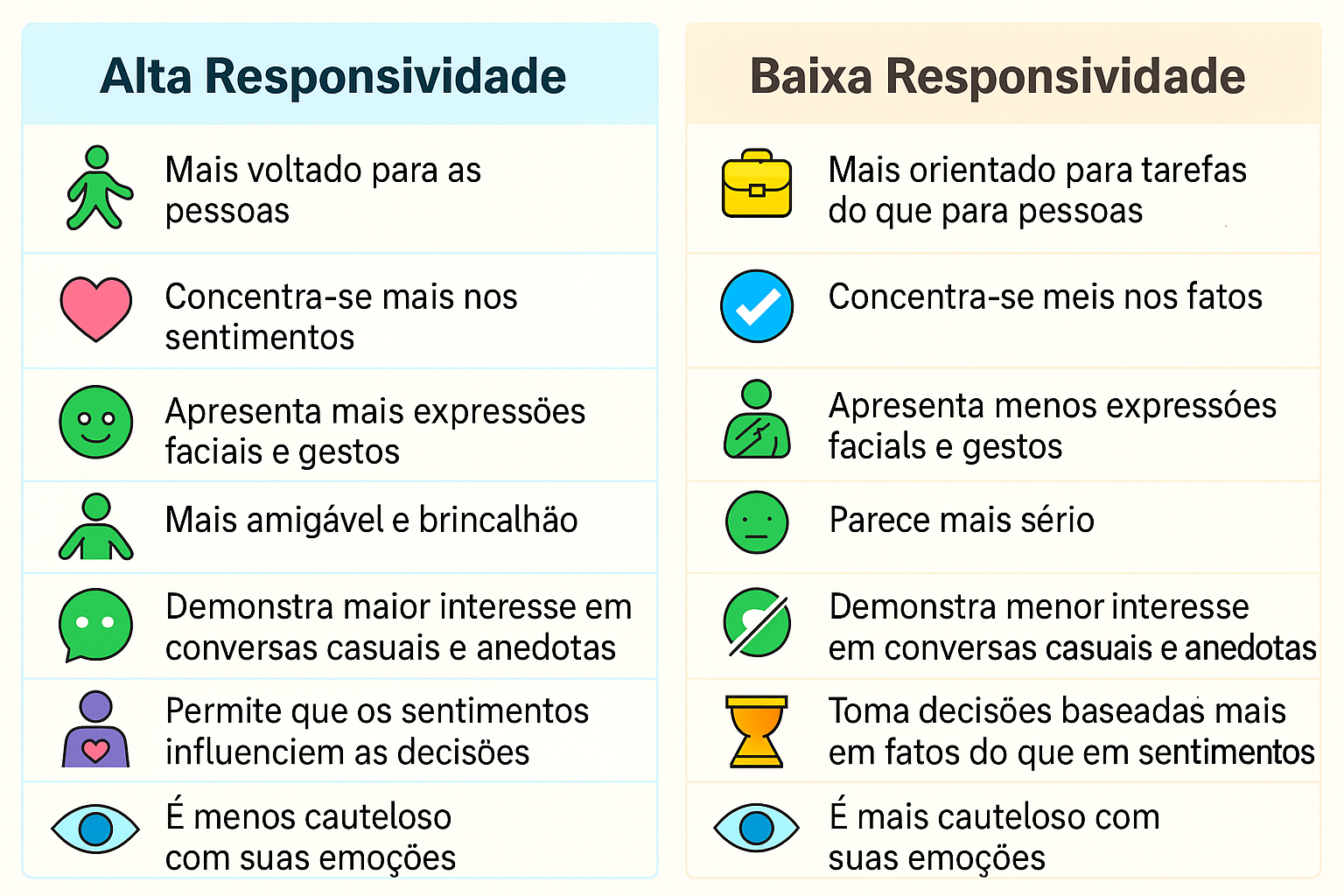 - Responsividade: é o quanto a pessoa demonstra emoções e reage às emoções dos outros. Quem é mais responsivo costuma ser mais caloroso e sensível às pessoas.